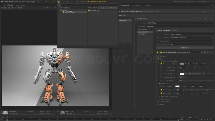 Katana 3.0 附带了来自3Delight厂商提供的渲染插件,实现了完全互动的实时渲染。实时渲染可以响应场景中灯光、着色器、摄像机、几何体、体积项、材质、全局设置等变化,带来了专注于艺术家的Katana体验。此外,运用新增添的独特工作流程,可以在完成的帧画面上交互式的调节光照或混合灯光,同时,编辑的结果还会直接反馈到Katana的GafferThree照明工具里的灯光或灯光组之中。 而完全基于OSL的着色引擎,同时兼容了Katana和Maya,最终实现了视觉开发文件在DCC应用程序之间的直接传输。
